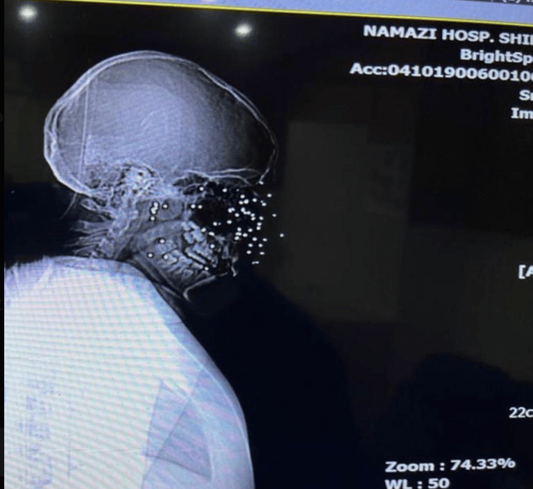 (Image, Source: X.com) Image Shows a Patient Hospitalized at Namazi Hospital, Multiple Metal objects are lodged in their cranium and facial area. They lost their vision as a result of the trauma from the gunshot.